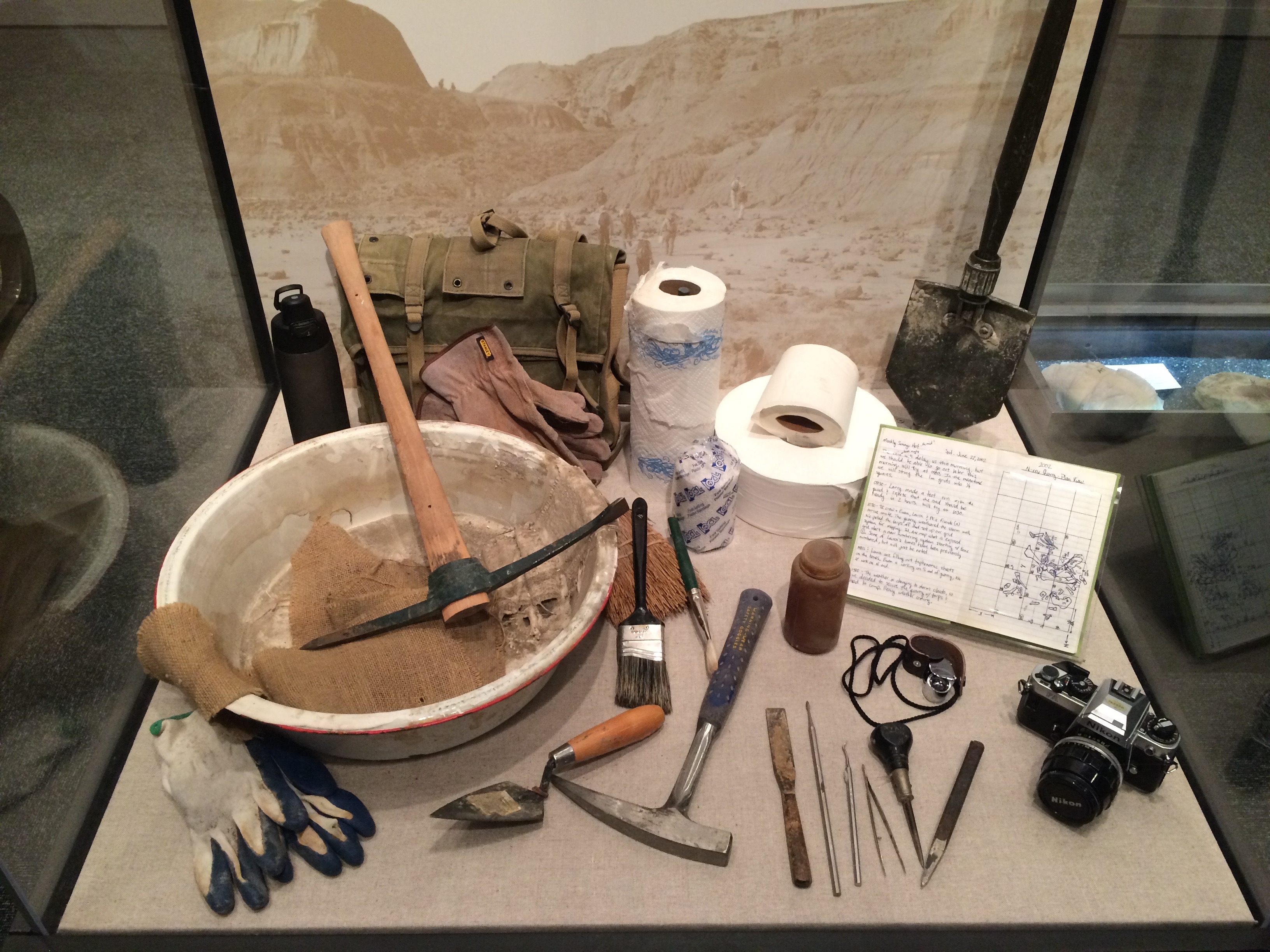 Taking them in reverse order, though the main dinosaur halls at NMNH are closed for refurbishment they have some impressive material on temporary display elsewhere in the museum. Included is a visible fossil lab with staff working on items brought in from digs, a video where the notebook is described as one of the key tools of the palaeontologist, and an actual field notebook on display alongside other equipment.